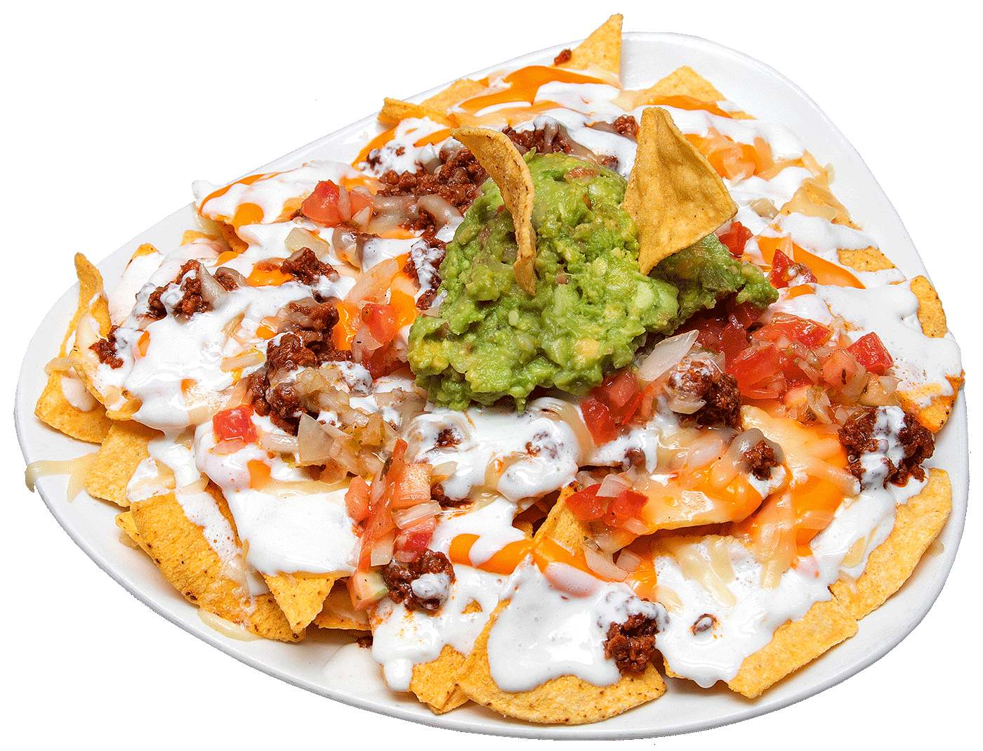Totopos de maíz, pollo cocinado, sour cream casero, guacamole casero, queso cheddar y queso Edam