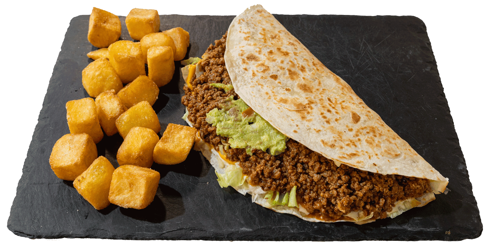 Con lechuga, queso cheddar, guacamole casero y sour cream casero