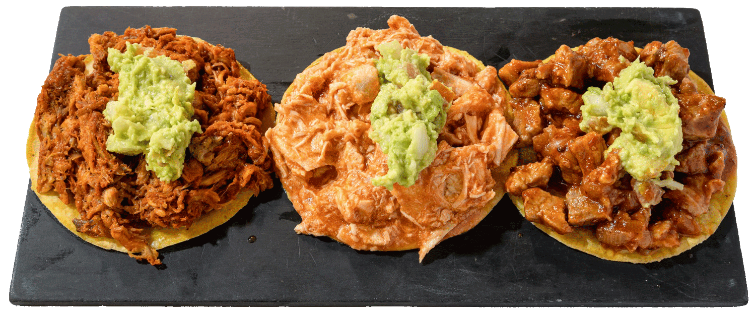 Pollo cocinado con frijoles mezclado con salsa de mole poblano, con queso cheddar, guacamole casero, sour cream casero y lechuga 2x1